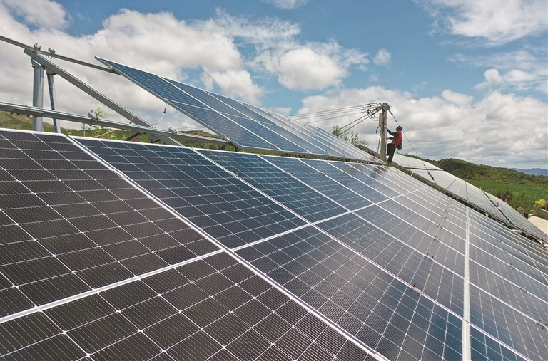 國網(wǎng)天鎮(zhèn)縣供電公司太行黎明共產(chǎn)黨員服務(wù)隊(duì)隊(duì)員在谷前堡鎮(zhèn)白羊口村對分布式屋頂光伏進(jìn)行隱患排查。