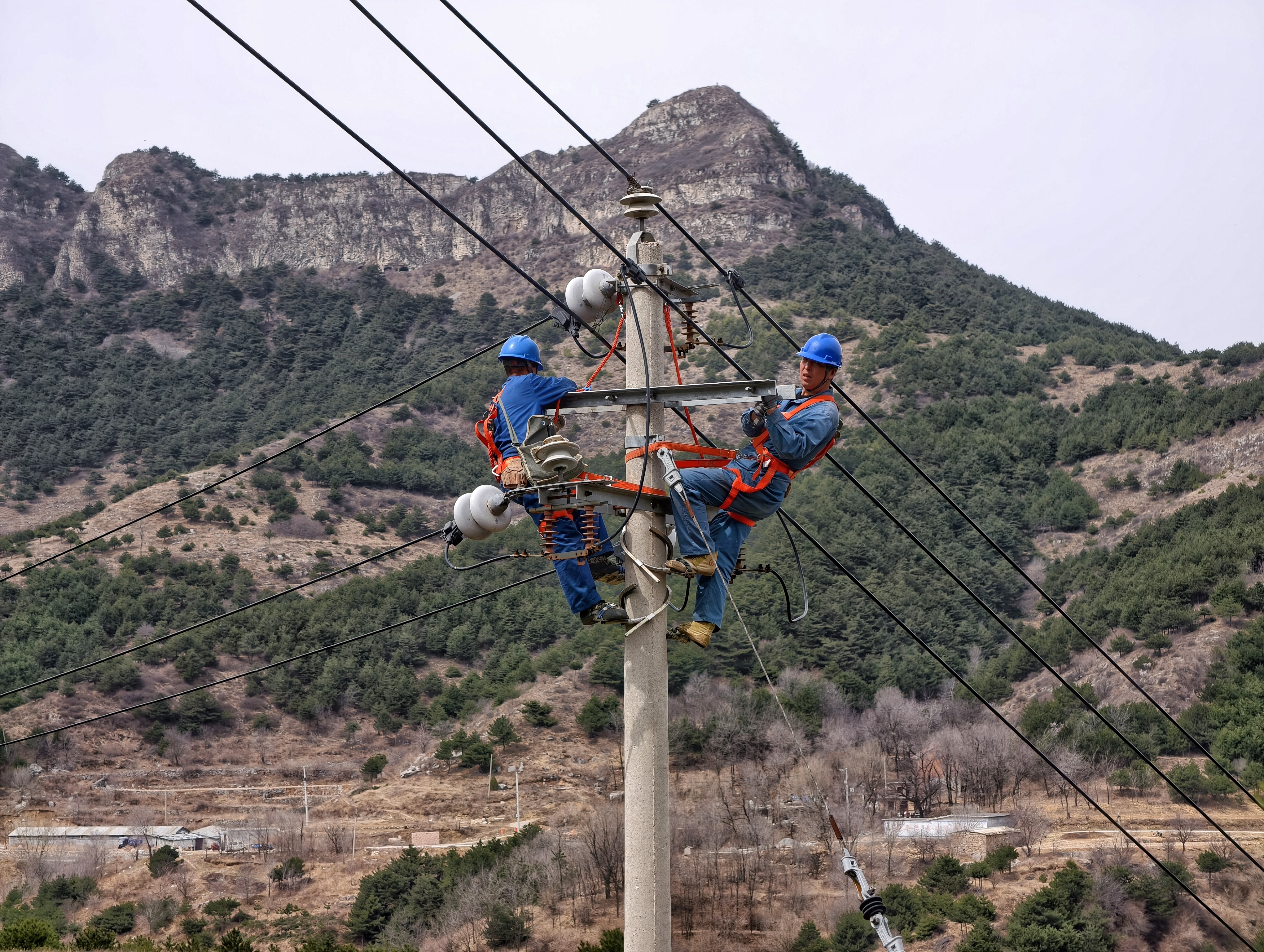 3月26日,國網(wǎng)長治平順縣供電公司員工在10千伏玉峽關(guān)線開展防火雙橫擔(dān)改造春檢作業(yè)。郭海波 攝